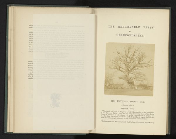 Editor: Here we have Ladmore and Son's photograph, "Gezicht op een wintereik", from around 1868, made using the albumen print process. It's quite striking, really, how the solitary tree commands such a quiet presence. What stories do you think this old oak could tell? Curator: Oh, if trees could talk, what sagas we'd hear! This image, to me, whispers of resilience. The stark branches against that muted sky... it's a melancholic beauty, wouldn't you say? Naturalism was peaking then; a reverence for nature, a yearning to capture its raw essence. Does that yearning speak to you at all, or do you hear something different in its tones? Editor: I hadn’t really picked up on the melancholy, more just...stillness, perhaps. I guess I can see it. Why photograph just one tree? Curator: Maybe Ladmore and Son saw in that single tree a mirror of the human spirit – standing strong, bearing witness to time’s relentless march, and capturing a quiet drama! Perhaps it was commissioned, or maybe it simply caught their eye with the grandeur it offered, prompting the picture and securing its placement here as The Tibberton Oak with so much storied local character surrounding it. What kind of legacy are we observing here, do you think? Editor: That's beautiful! I do see it now. It feels very...personal, like more than just documentation. Curator: Precisely! It invites us to contemplate not only the natural world, but also our place within it, the beauty that nature so unabashedly demonstrates. I think I might like to sit at its base and ponder exactly that on a late winter's evening, or read something of classic, wise, epic quality and simply just sit there and breathe it all in, almost experiencing all that it must. I'm very thankful it has a photo of it. It reminds us of ourselves. Thanks for guiding our look into the arboreal with our rooted brother!