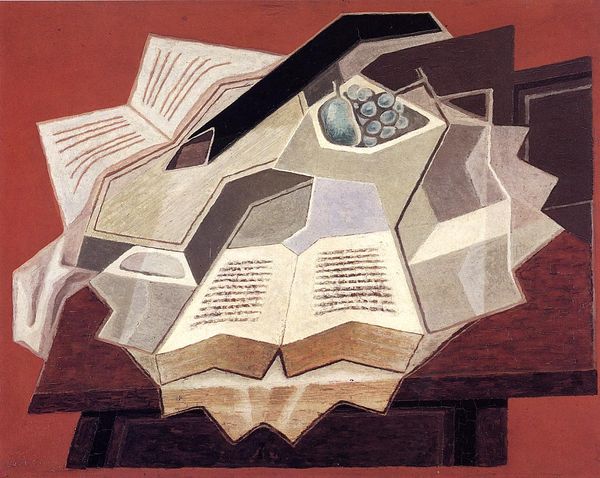 Editor: This is "The Painter’s Window," an oil painting by Juan Gris from 1925. It’s… well, it's certainly Cubist! I see familiar objects broken down into geometric forms. It feels a bit like looking through a fragmented memory. What do you make of this piece? Curator: It’s fascinating how Gris evokes a sense of simultaneity. Notice the window – is it a literal window, or a painting *of* a window? And how does the inclusion of the artist’s tools – the palette, the pipe – invite us into the very act of creation? Editor: I hadn’t thought about it that way. It’s almost like Gris is collapsing the space between the real and the represented. Does the symbolism speak to this tension too? Curator: Absolutely. Ponder the pears on the windowsill. Throughout art history, fruit often symbolizes mortality, but here, suspended in this Cubist space, does it acquire new meaning? Perhaps Gris is suggesting the enduring nature of art itself? Editor: Interesting. I see the playing cards too… Diamonds. Maybe representing value and risk… and could it be the atom card behind them, hinting at the scientific shifts of the early 20th century that reshaped our understanding of the world. It feels like so many layers are embedded into one, still image. Curator: Precisely! And note how the geometric shapes lock together: does this order invite you to accept it or challenge it? The objects and symbols together present memory, perhaps revealing our ability to piece the world together and re-write it, to remember it in what seems to be fragments and impressions. What is constant versus always in flux is certainly up for question. Editor: I’m beginning to see that it is less about representing reality and more about capturing a particular feeling of experiencing reality, a type of seeing. I’ll never look at a still life quite the same way again. Curator: Indeed! Gris compels us to question our perception of stability. He certainly urges me to examine that within.
