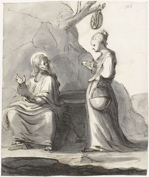Curator: This pencil drawing, currently housed here at the Rijksmuseum, is entitled "Lot and One of his Daughters" by Jan Swart van Groningen, dating from 1530 to 1535. Editor: Initially, I am struck by the contrasting textures. Look at the smooth skin of the daughter versus the gnarled bark of the tree, all rendered in the limited tonal range of pencil. There's a powerful simplicity in the composition. Curator: Yes, and those contrasting textures amplify the figures’ symbolic meanings. Jan Swart is drawing upon a story freighted with symbolic weight. The daughter's relative youth and exposed skin contrast sharply with Lot’s patriarchal beard and concerned gesture, as he proffers the plate. Do you pick up any possible inferences of incest? Editor: The plate does lend itself to speculation about its contents and, indeed, it might imply that he’s holding a vial filled with the beverage to lower his awareness. I observe, however, the expert application of hatching and cross-hatching which delineates the rounded form of his arm. And is that a turban to the side of his feet? Curator: The turban functions as an emblem. We should remember the historical context. Lot’s narrative was very much about rejecting eastern corruption in favour of covenant and custom. His family needed refuge. So that turban on the floor implies those themes were prevalent during the Northern Renaissance. Editor: Interesting that you point to historical interpretation, as structurally, the piece does evoke an implicit dichotomy. It also seems there is very little interplay, however. She, after all, has bare feet and her garment and headdress indicate she already anticipates corruption and incestuous behaviors. Curator: The positioning of her hand on her dress indeed suggests acquiescence, perhaps resignation. The story and Jan Swart’s drawing are grim reminders that sacred beliefs can get warped by patriarchal corruption. Editor: But that rendering in pencil also means it's mutable. It suggests it can easily be rubbed out and started afresh—a narrative constantly rewritten and reinterpreted. The artist shows it could just all be imagination, sketched and ephemeral. Curator: Exactly. And like memory, always incomplete, partial, and interpreted. The brilliance here, is that Jan Swart gives us everything but asks us to bring our own convictions to the act of viewing, of meaning-making.