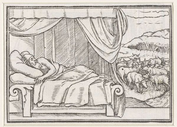 Editor: This engraving, "Miraculeuze genezing van een bedlegerige patient door de Heilige Hyacinthus van Polen" by Johann Sadeler I, dates back to between 1595 and 1600. The lines are so precise, and the scene has such a strong sense of both the earthly and divine. What historical context can we bring to its reading? Curator: This print invites us to consider the intersection of faith, gender, and power in the late 16th century. Here, a woman confined to her bed, powerless and presumably of some standing ("matrona" implies a married woman), is healed through the intervention of Saint Hyacinthus. How do you interpret the image in relation to the societal roles prescribed to women during that era? Editor: I suppose it emphasizes the reliance on the divine for health and well-being, especially when worldly remedies may have been limited. It positions women as vulnerable, but also as worthy of miracles. Curator: Exactly. And consider the Counter-Reformation context. Miracles were often highlighted to reaffirm the Catholic Church's authority. The print promotes a very specific power dynamic: the ailing woman's salvation comes not through her own agency but through male, divine intervention. This artwork reinforces the prevailing patriarchal structures, casting women as dependent on both religious and male authority. Editor: That's a darker reading than I initially considered. The miracle initially seemed like a message of hope, but it’s tied to social control. Curator: Precisely. Art often reflects and reinforces existing power structures. By examining the image through a feminist lens, we can unveil how it perpetuates certain ideologies. Consider too how visual rhetoric contributed to establishing early modern notions of gender, holiness, and sickness. Editor: Thank you; seeing it in light of social structures is powerful. I understand how faith, power, and the role of women intersect. Curator: I’m glad. Let's look at how Saint Hyacinthus is positioned...