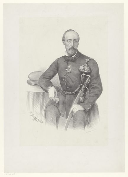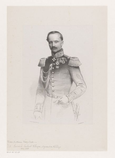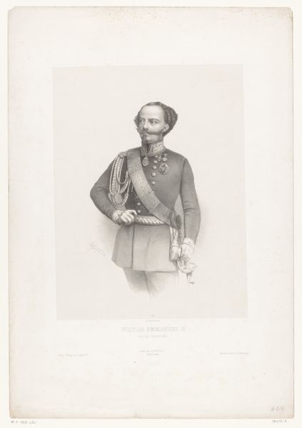 Jean-Baptiste Adolphe Lafosse created this portrait of Patrice de Mac Mahon, the French general and politician, using lithography, a printmaking technique notable for its capacity to produce subtle gradations of tone. Notice how the composition is rigidly structured around the verticality of Mac Mahon's figure, his gaze averted to the left, creating a sense of distance and authority. The lithographic medium allows for a remarkable rendering of texture, from the crisp detail of the military garb to the softer modeling of the face. Lafosse masterfully uses light and shadow to define form, creating a play of surface and depth that invites the viewer to perceive the work as a kind of semiotic field, where the signs of rank and status intersect with the nuances of character. The portrait is not merely a likeness; it is a carefully constructed representation of power and identity, reflecting the complex interplay between the individual and the sociopolitical structures of 19th-century France. Ultimately, its formal sophistication belies the inherent instability of such representations, inviting ongoing interpretation.