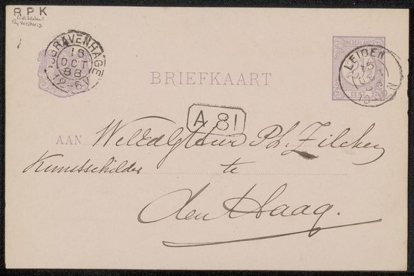 Curator: Ah, here we have something utterly charming: "Briefkaart aan Philip Zilcken," or "Postcard to Philip Zilcken." Attributed to Johannes de Koo, somewhere between 1851 and 1909. A simple ink drawing on paper. What do you make of its visual presence? Editor: Faded grandeur! It’s got that melancholic feel, you know, of things whispered across time. All these delicate stamps and scribbles, layered like echoes. I can almost smell the old paper. Curator: Precisely. Note the deliberate layout—a formal address juxtaposed with a postal system of seals, which transform the entire paper into a miniature composition. Semiotics are dancing here! It uses visual space and language in a tight dialogue. Editor: A tight dialogue indeed, although the signature is wonderfully sprawling. It feels almost subversive, like the sender is trying to escape the formality of the "BRIEFKAART" label above. It's breaking the grid. The imperfection creates space. Curator: Yes! The flourish embodies an unspoken energy. And that violet ink, particularly in the stamps, gives such an austere refinement, elevating an everyday form into… well, almost something royal. Editor: Royal and fragile at the same time. And it really evokes this pre-digital, analogue beauty... which might make me sound like an old romantic. Curator: Never! It reminds us of what gets lost, of course, as much as what has been sent. Ephemerality cast in ink... lovely. Thank you! Editor: And thank you! Seeing the mundane elevated into the sublime? It’s postcards like these that really keep us searching for something deeper in the simple things.