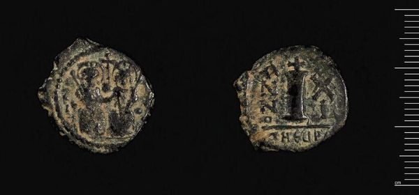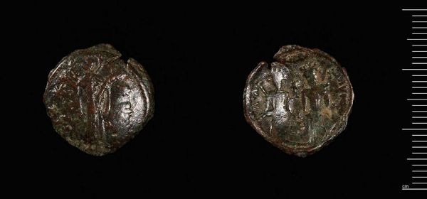 Curator: Here we have a coin attributed to Justin II, part of the Harvard Art Museums collection. It appears to be quite worn. Editor: Indeed. The piece possesses a weighty solemnity, accentuated by the patinated surface and fragmented edge. Its circular format, or what remains of it, invites the hand. Curator: As a tangible piece of currency once authorized by Justin II, what does its imagery tell us about the emperor’s ambitions and the socio-political messaging of his reign? Look at how the symbolic language of the cross permeates the design. Editor: Notice the cross is almost graphically assertive against the subtly modulated metal surface. It’s a powerful, somewhat austere composition. Curator: It is interesting how material objects, despite their scale, can unlock expansive insights into power, belief, and exchange. Editor: Quite right. There is a strange beauty in such decay.