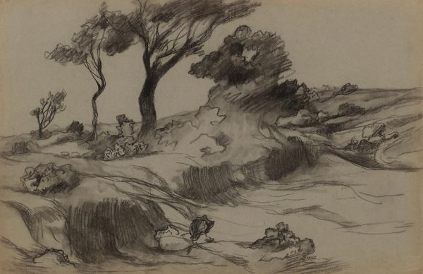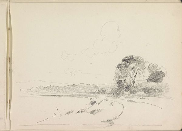 Curator: This is Joan González's drawing, "A Large Cloud." Though undated, González worked predominantly in the late 19th century. What do you make of this simple sketch? Editor: Stark. A landscape, yes, but dominated by the mood, that big brooding cloud hanging over everything, like a thought you can’t shake. Curator: The Tate acquired this piece, which is executed with pencil on paper, precisely because it speaks to the artist's broader concerns with depicting atmosphere and landscape. Editor: It’s funny, isn’t it? How something so minimal can feel so complete. The trees reaching up, almost clawing at the sky, that figure… it’s like we’re all just figures in a much bigger, less defined, drama. Curator: It’s also a striking example of how artists used drawing as a tool for observation and documentation before the widespread use of photography. Editor: Makes you wonder what he was feeling, standing there with his pencil, trying to capture all that…weight. Anyway, I’m off to find a sunnier room, metaphorically speaking. Curator: A sentiment I understand completely. Thank you.