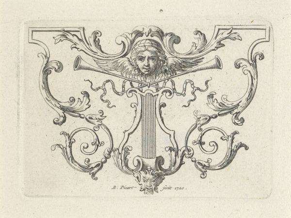 Editor: This is "Ornament met mascaron en toortsen," created by Bernard Picart in 1727. It's an ink and pen drawing, a delicate dance of lines. I’m immediately struck by how playful and theatrical it feels. What do you make of it? Curator: Theatrical is spot on! It's like a stage set waiting for a drama to unfold. To me, Picart is playing with ideas of status and identity in the 18th century, inviting us to consider how people wished to be perceived through their designed world. It’s all about crafting a persona through carefully chosen details. Look at that central mascaron – the ornamental face – and those torches! What story do they tell you? Editor: I guess the torches signal celebration or maybe knowledge? And the face… it’s so stylized. Is it supposed to be a specific person? Curator: Probably not a specific person, but rather an ideal, a representation of beauty and taste at the time. Those intertwined floral garlands and geometric frames – they are all about refinement and control. But doesn’t the face feel a little… trapped within all that elaborate structure? A commentary, perhaps, on the constraints of societal expectations? Editor: I hadn’t thought about it that way. The ornament almost overwhelms the face. Curator: Exactly! It's a subtle tension between freedom and constraint. Do you think the controlled exuberance is exciting? Or maybe a little bit too much? Editor: I can see both! It's over-the-top but fascinating. It definitely makes you think about how people present themselves. Curator: Right? It shows that design can reveal as much as it conceals. Editor: Definitely given me a fresh take on Baroque ornamentation. Thanks!