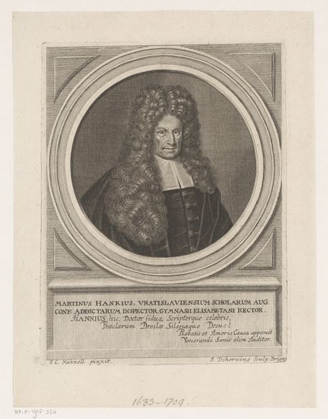 Curator: Welcome. Let’s take a moment to consider this intriguing portrait. It depicts Johann Christoph Pfaff, dating from sometime between 1687 and 1743, rendered in engraving. Editor: You know, immediately, I'm drawn to the almost comical abundance of hair. It's as though his wig has a gravitational field all its own, threatening to consume the poor fellow. Curator: Well, such hairstyles were fashionable and indeed signaled status at the time. These elaborate wigs served a specific purpose in baroque society. More important than that, look at the way Mentzel uses engraving to carefully depict this intellectual figure within a formal portrait. The inscription below suggests his profession: theologian and professor. Editor: Absolutely! But for me, it’s all about texture, all that intense line work trying to catch that weight of the wig, or the formality of his clerical robe. Do you think he ever looked in the mirror and thought, "less is more"? Or did image dictate everything back then? I wonder… Curator: Image was paramount. Portraits, especially engraved ones like this, disseminated power and solidified reputation. The choice of engraving ensured its reproducibility. Pfaff's ideas would have been amplified and shared with fellow academics via this method. Editor: And maybe he saw this portrait and thought, "Finally, my hair gets the recognition it deserves!" Do you ever consider what they would really think about seeing themselves immortalized in museums centuries later? Curator: The portrait itself provides clues! He likely envisioned himself as a figure worthy of historical record. That's part of what artworks did—and continue to do—as public assertions of personal and political legitimacy. Editor: Right. Perhaps it's less about accuracy and more about constructing legacy. What is amazing about images such as these is what is going through his mind and the story it creates for the viewer to build off. Curator: Precisely! That's the enduring power of these kinds of portraits, isn't it? Editor: Definitely gives you a whole different appreciation, doesn’t it?