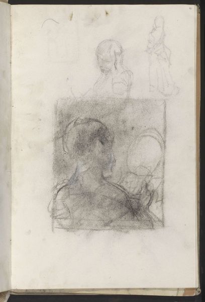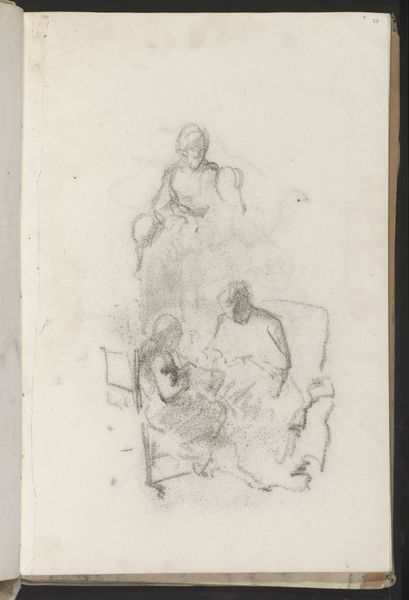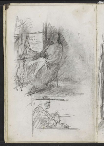 Curator: This unassuming pencil drawing offers a glimpse into the domestic sphere, dating sometime between 1854 and 1914. The piece, titled "Jonge vrouw zittend in een interieur" by Albert Neuhuys, captures a young woman seated in what seems to be the interior of a home, currently held in the Rijksmuseum collection. Editor: My first impression is one of quiet introspection. There's a gentle melancholia to the sketch. The hazy pencil strokes suggest a memory or a fleeting moment captured rather than a precise portrait. Curator: That impression resonates. Viewing this sketch, I think it invites us to consider the constrained roles often imposed upon women during this period. Confined to domestic spaces, their lives and identities were frequently reduced to their roles as wives, mothers, and homemakers. Editor: Indeed, but even within that context, the chair itself as a motif suggests social standing, or even imprisonment. We often perceive a seat as a source of rest, but here the chair is almost a continuation of her garment, as if they were a single item. Notice, also, the linear strokes surrounding her almost obscure the domestic space she is meant to inhabit. Curator: That resonates with recent dialogues around space, especially within a feminist theoretical framework, and highlights how spaces, both physical and symbolic, can become sites of both oppression and resistance. There seems to be the visual construction of domesticity but also a kind of erasure of specificity. The young woman's face is turned away and obscured by hatching and line. Editor: Perhaps she also carries echoes of traditional madonna iconography? We observe a somber, gentle face framed by clothing and the surrounding enclosure. Light and dark hatching almost serve to halo the woman, an interesting consideration considering the secularity of domestic labor in the late nineteenth century. Curator: I appreciate the point about a pseudo-religious framing. While it's speculative, it does suggest the possibility of reading this seemingly simple sketch as something far more layered and complex in terms of its symbolic representation of female identity. Neuhuys appears to capture something fundamental about the lives and roles of women that endures. Editor: I agree completely. And by stripping away any of the specificity with this 'incomplete sketchy' drawing, the piece presents an icon that extends into and throughout history, a memory, perhaps, to the female domestic role throughout civilization. Thank you for that insight. Curator: It's been a pleasure to consider how this deceptively simple sketch speaks to enduring complexities surrounding the female identity within a sociohistorical setting.