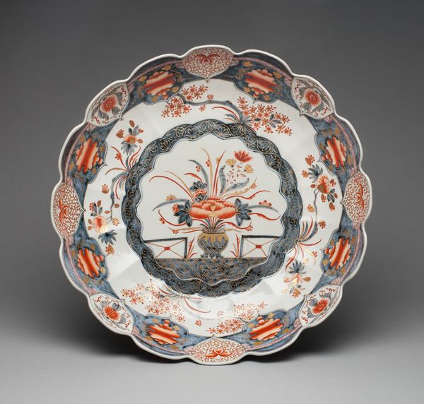 Editor: So this vibrant ceramic plate, likely dating back to the mid-18th century, comes from the Roos Manufactory. I'm struck by its colorful decoration—so many fantastical creatures! It has this dreamlike, playful energy, almost like a porcelain fairytale. What do you see in this piece that I might be missing? Curator: Well, the first thing that catches my eye is the almost overwhelming array of imagery—phoenixes, kirin, landscapes crammed into one circular frame. Imagine this plate sitting on a European table in the 18th century. It’s a statement, right? A brag, in a way, about access to the exotic East, even if the understanding of the imagery was probably a little... fuzzy. It makes me wonder about what fantasies and realities were mixing for people back then. Do you feel like that fantastical quality has changed between then and now? Editor: Absolutely! Today, with easy access to other cultures, seeing it framed as "exotic" feels...well, dated. Back then, though, this plate might have been one of the few glimpses someone had into an entirely different world! But how accurately do you think these "glimpses" reflect Asian art? Curator: Accuracy wasn't really the point, was it? It was about conjuring a sense of the Orient. The makers of these objects were weaving tales as much as they were creating decorative pieces. In fact, something I love about this kind of art is how freely cultures interact; that to me represents a more global reality of trade, inspiration, and human nature. Editor: That's such a fantastic way to think about it, actually! It’s not so much a window as a remix. A reminder that objects tell stories—or, perhaps more accurately, spark them. I feel I can see this "Plate" through a different, more thoughtful lens now.