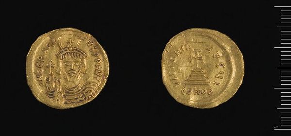 Editor: Here we have a gold coin of Justinian II. What strikes me is the detail achieved on such a small object. What can you tell us about its production? Curator: The coin's gold material and the detailed figuration speak volumes about the Byzantine economy and social hierarchy. How did the process of minting and distribution reinforce Justinian’s power? Editor: So, you're saying the value isn't just monetary, but also symbolic in terms of labor and power? Curator: Precisely. Consider the workers extracting the gold, the artisans creating the die, the officials overseeing production, and how it all contributes to the coin’s inherent value beyond its weight. Editor: I never thought about it that way. It's more than just currency; it’s a record of the entire social and economic structure. Curator: Indeed, and this piece provides a lens for exploring the intricate connection between art, labor, and the assertion of imperial power.
