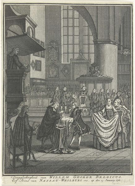 Editor: Here we have Jan van Vianen's "Heren en dames lezen de bijbel in een kerkinterieur," from 1699. It's an engraving housed at the Rijksmuseum. I'm struck by how rigid and formal everyone appears, almost theatrical. What's your read on this piece? Curator: I see this engraving as a window into the socio-political landscape of 17th-century Dutch society, particularly concerning religious practice and the performance of social roles. How do you interpret the composition of men and women segregated within the church setting? Editor: I hadn't considered the separation so directly. It appears so normal but maybe it reveals gendered expectations of religious engagement at the time? Curator: Precisely. The clear visual distinction and implied separation points to how societal expectations shaped and controlled access to knowledge and authority, right? Who do you think had more agency here, and how would that be demonstrated visually? Editor: I suppose the men sitting at the table seem to occupy a place of greater authority, seemingly guiding the service, with open books in front of them. But are women really excluded here, as active participants, or as readers, too? Curator: That's an insightful question. The engraving exists in conversation with contemporaneous ideas about knowledge, religion, gender, and social standing. Understanding this artwork requires us to situate it within those debates. What questions does it raise for you about religion's impact on marginalized populations, particularly at the time? Editor: It's fascinating to consider it not just as a depiction of a religious scene but also a statement about the social order and how power dynamics were visually represented and reinforced. Curator: Exactly. And hopefully by looking through this intersectional lens, you are one step closer to finding a broader approach to artworks in our collection.