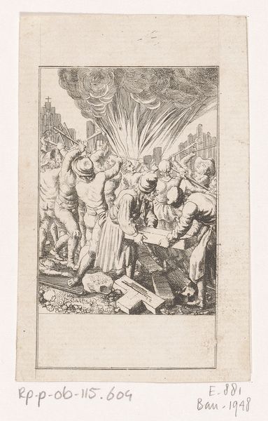 Curator: Jan Caspar Philips created this engraving, an Allegory with Martyrs, sometime around 1739 or 1740. It’s currently held here at the Rijksmuseum. What strikes you first? Editor: Well, the immediate impression is rather somber. Despite the baroque flair, the dense composition and monochrome rendering create a sense of oppressive weight. Curator: That density is typical of baroque allegories, designed to convey multiple layers of meaning simultaneously. You see the central figures illuminated, surrounded by scenes of apparent chaos and martyrdom. Editor: Exactly, but the positioning feels staged. Look at how those building the pyre seem almost theatrical, each caught in a carefully arranged pose. It suggests a political theater meant to legitimize violence against certain groups. Curator: That's an astute point. Engravings such as this one often played a critical role in shaping public opinion and religious identities. It invokes religious fervor. Note the angels in the sky, suggesting divine approval. Editor: And that central figure wearing a laurel crown presiding over this ritualistic execution is powerful. The artist surely meant to glorify sacrifice and martyrdom. Curator: The engraving serves as propaganda for religious piety. It underscores the concept of divine reward after worldly suffering. And Philips’ technical skill shines in his handling of light. It brings clarity, while also creating stark contrasts that emphasize the drama. Editor: Yet, the problem remains the normalization of violence. The piece promotes, however indirectly, the kind of zealotry that allows for such atrocities. Shouldn’t we examine the implications of presenting images of martyrdom outside of purely art historical circles? Curator: That's an essential conversation to have. These historical objects inevitably become implicated in present-day conversations about religious extremism. Studying pieces like this necessitates a frank discussion. It exposes how images can shape narratives. Editor: Agreed. Recognizing and resisting the potential for manipulation seems a critical skill in navigating historical artwork and contemporary image culture. Curator: Thank you, these complex narratives allow us to approach our shared history with more depth.