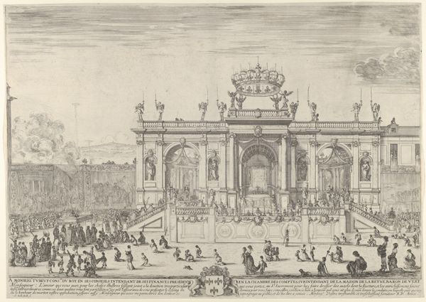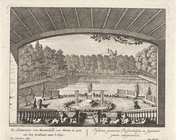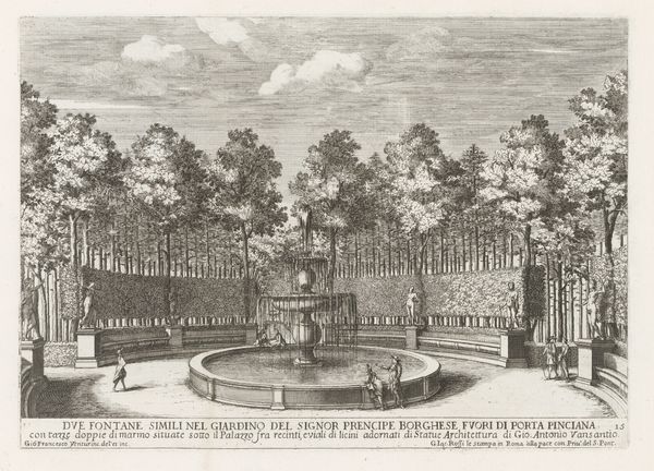 Curator: The print we're looking at today is "Teatro delle Acque in de tuinen van de Villa Aldobrandini te Frascati," created between 1653 and 1691 by Giovanni Battista Falda. It's a captivating engraving that depicts the architectural grandeur of the Villa Aldobrandini gardens. Editor: Immediately, I'm struck by the ordered symmetry fighting against the unruly nature. It feels like a stage set, all dramatic lines and receding perspectives, softened just a bit by the teeming activity in the foreground. Curator: Precisely! Falda was documenting the designed landscapes that were markers of power in that period. Aristocrats used these gardens to project authority. The print shows how these spaces became sites for social performance and leisure, illustrating their role in shaping aristocratic identity. Editor: And those theatrical water features! Water is often a symbol of purification, rebirth and transformation. Here, combined with the formal structure, it elevates the spectacle to something almost religious, but still thoroughly grounded in worldly pleasures if we consider the joyful activities captured in the foreground. Curator: Absolutely. The gardens also reflect a conscious revival of classical ideals. These meticulously crafted spaces were more than recreational; they were loaded with cultural aspirations. This print is significant because it helped disseminate those aspirations, influencing garden design throughout Europe. It effectively 'published' the Aldobrandini's aesthetic. Editor: I'm especially drawn to how the engraver uses line to differentiate between the robust architecture, almost skeletal in its precision, and the softer organic shapes of the landscape. It reinforces that tension between order and nature that you pointed out. Also, notice how the crowd activity adds a playful dimension that speaks of more than formal display; it signifies human connection. Curator: Considering how Falda operated within a network of artists and patrons who actively promoted a vision of Roman grandeur, what resonates most is that prints like these not only recorded existing spaces but also helped shape social ambition and the collective cultural imagination. Editor: Yes, and it shows us the power of images to hold layers of symbolic weight – from pure aesthetic delight to reflections of social positioning. I feel a richer appreciation of how the print freezes a fleeting moment, preserving that garden’s symbolic importance for centuries.