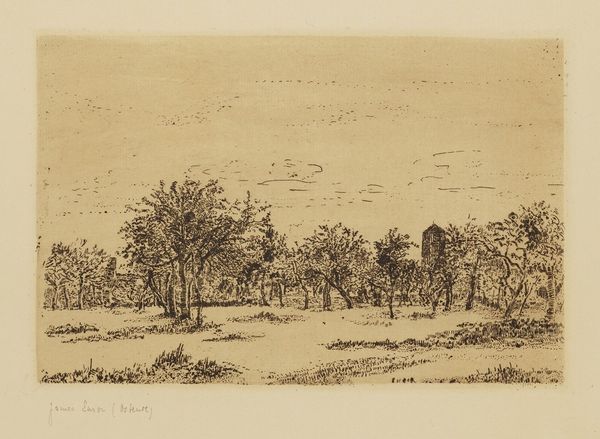 Editor: This is James Ensor’s etching titled "Bosje," created in 1888. It's a detailed rendering of trees, created with the intaglio printmaking method. I’m immediately drawn to how dense it feels despite being just lines on paper. What's your perspective on this particular print? Curator: The beauty lies within the artist’s labor of production, doesn't it? Look closely at the etched lines and the spaces in between. Each line had to be carved painstakingly with precise, repetitive movements. Considering the industrial revolution and rise of consumerism at the time, this emphasis on individual artistry resists mass production, no? What’s compelling is not just the depiction of trees, but the demonstration of slow, manual craft in contrast to prevailing mechanization. Editor: I see what you mean about it being a physical process! Does the choice of etching as a medium enhance a commentary on the value of labor, or even on nature as something worked and shaped by forces outside itself? Curator: Precisely! Ensor consciously chooses a medium requiring great skill. While a painting conceals that labor under layers of color, an etching exposes its linear, step-by-step construction. The lines become a record of the artist's action. What is also revealed by that repetitive rendering? Editor: Maybe it underscores how landscapes are shaped by both natural processes, like erosion or growth, but also labor like land cultivation, if that makes sense? The little building on the edge hints at that tension. Curator: Absolutely. He's calling our attention to these relationships through material engagement. I'm so glad you observed the building on the edge. Can we reflect upon how nature isn’t something purely ‘natural’ for us as viewers anymore but already manipulated? Editor: Thinking about the etching process and the landscape as subjects has made me appreciate the intricate labor involved in what initially seemed like just a pretty scene! Thanks for highlighting all of that. Curator: And in that reflection, perhaps we consider not just "what" is depicted, but "how" it comes into being as an object that can shape what we value, and consume.