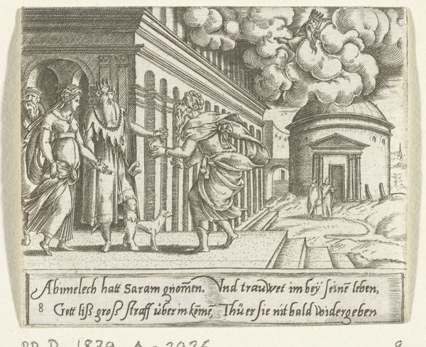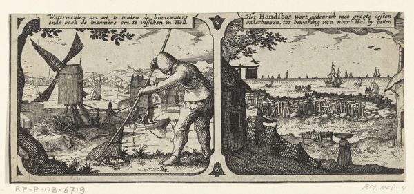 Philips Galle created this engraving, "Bijenteelt," in the late 16th century. The composition, confined within a horizontal rectangle, depicts a bee-keeping scene rendered with meticulous detail and stark contrasts of light and shadow. This formal structure draws our eye across the landscape, from the clustered hives on the left to the figures busily working on the right. The engraving technique, with its dense network of lines, creates a textured surface that mimics the rough, organic forms of the natural world. Galle uses linear perspective to organize the pictorial space, yet the flattening effect of the engraving process emphasizes the surface, calling attention to the artwork's constructed nature. The cultural codes embedded in the image suggest a world governed by labor and industry. The tension between the idyllic pastoral setting and the rigorous, almost militaristic organization of labor reveals a deeper meditation on humanity's relationship with nature. This work doesn't just present a scene but prompts a dialogue on the values and systems that shape our perception and interaction with the environment.