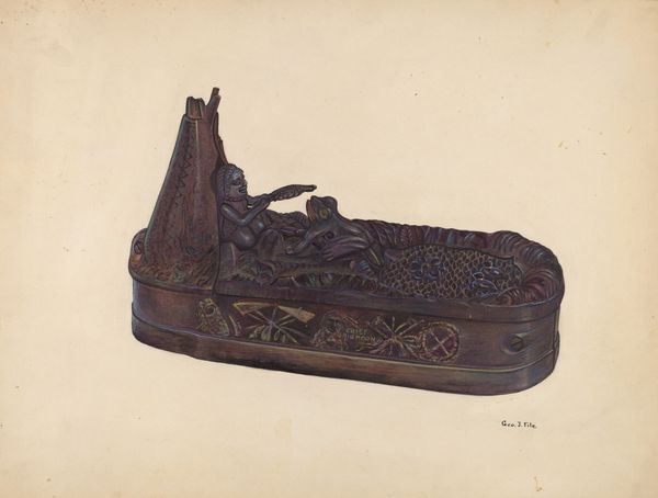 Editor: This is Virginia Berge's "Woman's Slipper," a watercolor and drawing from around 1941. I find the intense detail fascinating; the floral needlepoint on the slipper itself looks incredibly intricate, like a miniature tapestry. How do you interpret this work, especially considering its historical context? Curator: It's easy to overlook everyday objects, but Berge elevates this slipper through the act of meticulous representation, prompting us to consider its cultural significance. Slippers in the 1940s weren't merely functional items. They reflect a particular domestic ideal. Who would have worn this slipper, and in what social settings? These questions become very relevant. Editor: That’s interesting. The detail does suggest care and possibly status. Curator: Exactly. Art like this functioned often as documentation during the period. Consider the emphasis on realism, mirroring the documentary aesthetic championed by institutions at the time, particularly given socio-political events taking place. Editor: Do you think there's a statement about domesticity intended? Curator: Absolutely. The choice to portray such an intimate object, especially during wartime when notions of home were fraught, reinforces the slipper’s symbolic value. Its creation would resonate with viewers, touching the sentiments related to what was at stake in domestic life at the time. Is it celebrating it? Or is it wistful about its fragile existence at a precarious time? What do you make of that now? Editor: It reframes how I view the artwork! Thank you! Curator: My pleasure, understanding how cultural values shape what artists choose to depict provides insights. It makes something mundane more meaningful.