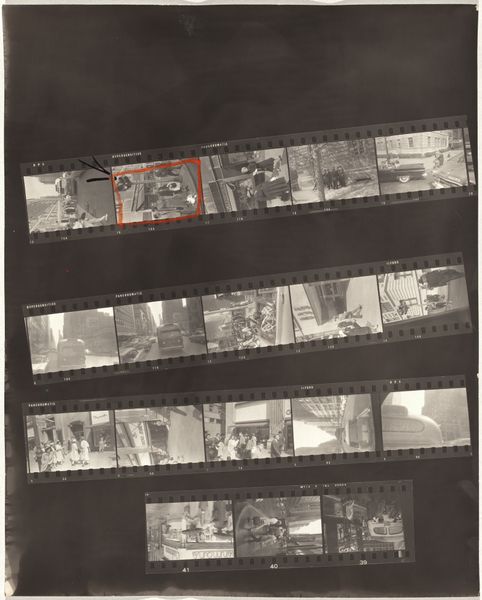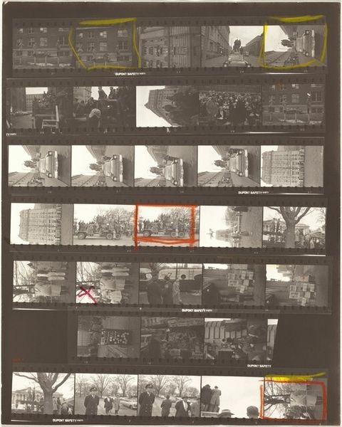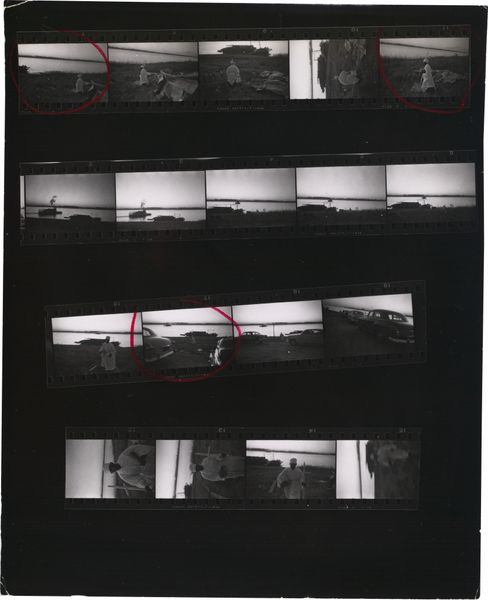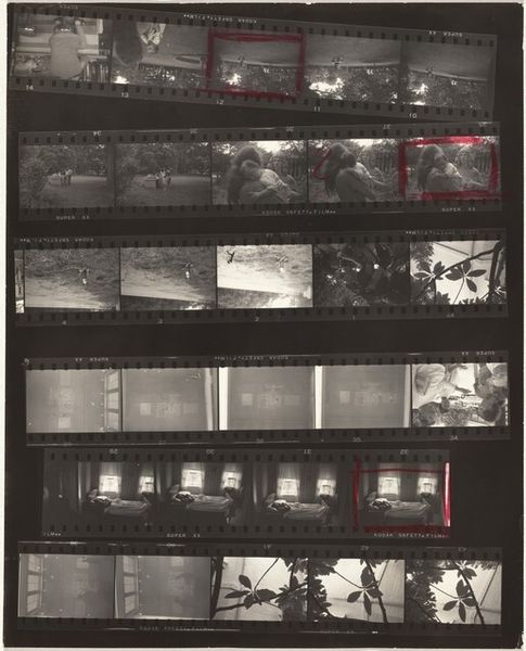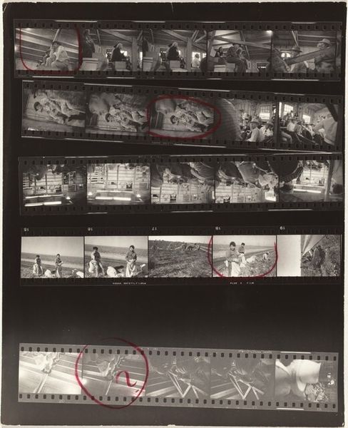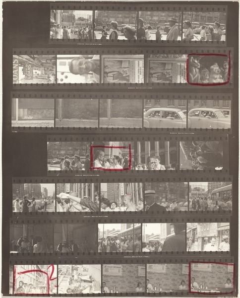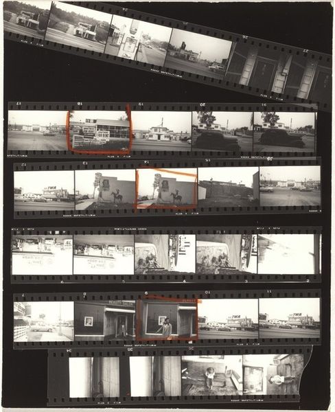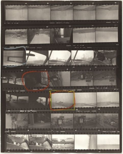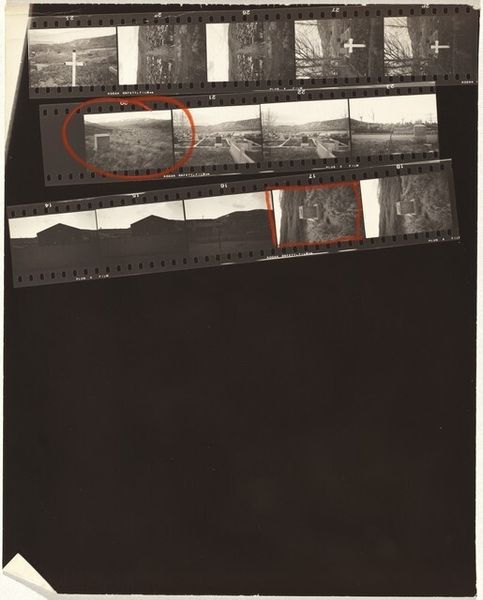 Robert Frank made this work, Guggenheim 645A/Americans 57--San Francisco, using gelatin silver print. It's a contact sheet, so we're seeing the raw material of his process, the outtakes, the almost-weres. The scratches and dust, the red grease pencil marks circling certain frames, all become part of the story. It is about choosing and arranging, isn’t it? The tonal range is beautiful, from the dense blacks of the film strips themselves to the soft grays of the cemetery landscapes. Look at how the light catches the headstones in the top row, each one a tiny, ghostly rectangle. That repetition, that rhythm, it’s almost like a musical score. Frank has a way of finding poetry in the everyday, or maybe it’s more accurate to say he finds the everyday in poetry. Like Walker Evans, Frank sees America as a place of quiet dignity and melancholy. It’s not about grand gestures but about the small, almost overlooked moments that make up a life.