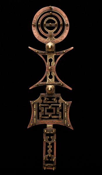 Editor: This is a silver pin from the 20th century, crafted by a Navajo artist. It’s at the Minneapolis Institute of Art. The piece depicts a stylized bird, almost geometric, and the combination of avian imagery with the metallic material gives it a somewhat ethereal feeling. What do you see in this piece? Curator: The first thing I notice is the synthesis of symbols. The bird is, of course, a powerful symbol across cultures, often representing freedom, the soul, or a connection to the divine. But here, within the bird's chest, is a cross. Editor: Interesting. How do you interpret that combination of symbols? Curator: It prompts us to consider the complex interaction of Indigenous beliefs and the influence of Christianity. Was this piece created for a Navajo audience, a non-Native audience, or both? And what would each audience glean from it? The visual vocabulary is rich and multilayered. Consider also how the metal itself embodies cultural memory, reflecting light and shadow much as stories themselves shift and change over time. Editor: That's a great point about the intended audience. It really changes how we understand the piece. It's fascinating how a simple image can hold so much complexity. Curator: Indeed. Each line, each form carries weight. Ask yourself, what does the upward-pointing direction signify in different cultures? And how might its meaning be reinterpreted or affirmed here? Editor: Thinking about the historical context helps unlock new levels of meaning in the art. I really appreciate that, thank you!