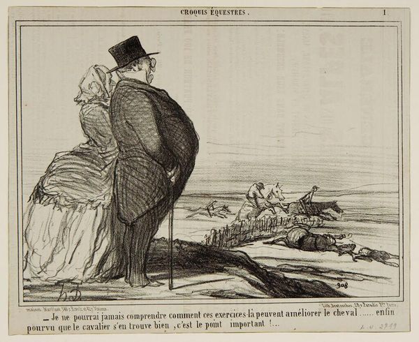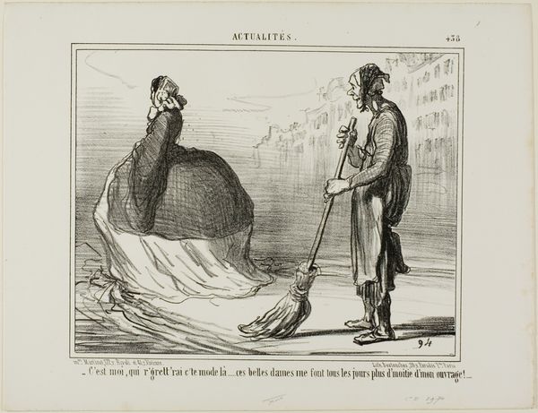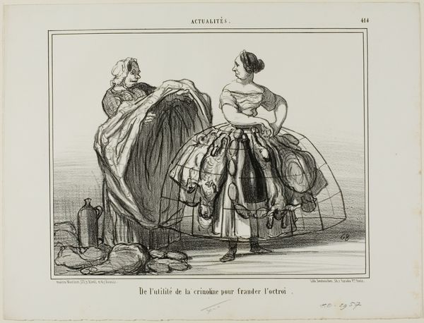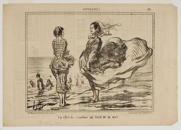 Honoré Daumier made this lithograph, titled "An Effect of Crinoline at the Seaside," in 19th-century France. It cleverly satirizes the fashion of the crinoline, a rigid, bell-shaped undergarment that expanded women's skirts to an enormous size. Published in the "Actualités" section of a satirical journal, the print offers a commentary on contemporary life. Note how the wind inflates the woman's crinoline, turning her into an almost comical, sail-like figure. Beside her, the working-class man is struggling against the wind. Daumier uses this image to mock the upper classes, portraying them as ridiculous. But the image is not merely humorous; it touches on the deep social divisions that marked French society at the time. Historians rely on sources such as fashion plates, journals, and caricatures to understand the cultural context. By analyzing these materials, we gain insight into the ways that art reflects and shapes social attitudes. The power of art lies in its ability to capture the spirit of an age.