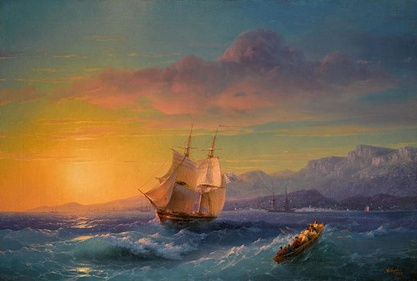 Ivan Konstantinovich Aivazovsky captured “Ships at the Feodosiya raid” with oil on canvas, presenting a vista that balances nature's grandeur with human endeavor. The luminescent sky merges with the sea in a harmonious blend of yellows, oranges, and blues, evoking both the sublime and the serenity of the marine environment. A formal analysis reveals Aivazovsky's command over composition and light. The play of light on water is particularly striking; each wave reflects the sun, creating a semiotic dance between illumination and depth. The artist’s choice of color constructs meaning; the warm hues signal hope, while the cool blues suggest the sea's implicit dangers. The structure of the piece—with ships arranged in an orderly fashion—might reflect a broader commentary on man's ability to organize and navigate nature's vastness. The painting destabilizes simple narratives by positioning a small sailboat in the foreground against imposing battleships. This contrast challenges fixed notions of power, suggesting perhaps, the vulnerability of man against the backdrop of history and nature. It is this formal contrast that invites ongoing reinterpretation of our relationship with the world.