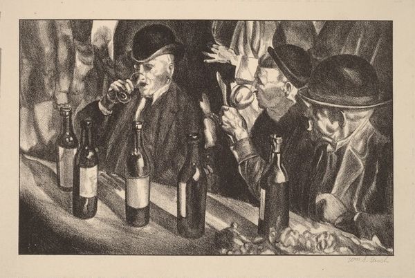 William Soles created this print, "Untitled (Playing Checkers)," using a woodcut technique. This is a relief printing process, where the artist carves away areas of a woodblock, leaving a raised design that will be inked and printed. The stark contrast between black and white emphasizes the textures and forms within the scene, from the rough-hewn walls to the men’s clothing, their faces etched with character. This image tells us a great deal about the rural setting that is likely being portrayed. The woodcut medium itself carries social significance. It’s a technique historically accessible to a wide range of practitioners, not requiring specialized equipment beyond carving tools and a press. The labor-intensive process, in contrast to industrial methods, imbues the print with a sense of handmade authenticity, a direct connection to the artist's hand and the world they depict. Looking at this woodcut, we are reminded that art is not just about the image, but also about the materials, the making, and the context from which it emerges.
