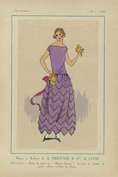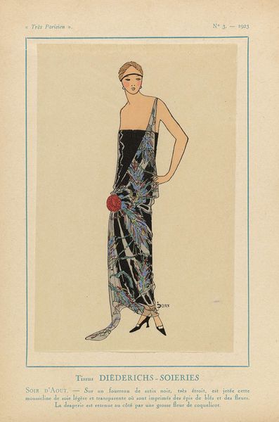 Curator: Let’s take a look at this drawing from 1923, "Trés Parisien, No 10: 3. - TIMIDITÉ. - Ce long fourreau..." Currently held at the Rijksmuseum, it's a remarkable piece illustrating fashion in the Art Deco era, rendered in ink and watercolor. Editor: Ooh, stylish! But "timidity?" That bold graphic shadow says anything but. Look at the flapper's posture – almost challenging you, all cheekbones and perfectly placed hands. Ironic, really, I adore it. Curator: Well, the title is indeed intriguing when contrasted with the model's apparent confidence. "Ce long fourreau"—"This long sheath"—likely refers to the dress itself, an iconic garment of the period, reflecting the societal shifts empowering women at the time. The drawing, while seemingly simple, participates in the commercialization of Parisian chic, setting trends. Editor: Exactly! Think about the context. Women were ditching the corsets for slinky dresses. The dress, which *sheath* really understates, is all sinuous curves and shimmering fabrics, reflecting the energy of jazz. The artist probably aims to encapsulate the elusive quality of *la Parisienne,* someone unattainable yet modern. Curator: Fashion plates such as these were incredibly influential, dictating the styles and aspirational image of the era, contributing to an industry driven by constant reinvention. These works capture not just garments but the zeitgeist of a society in flux. Editor: You know, it makes you wonder. Did any real women dress exactly like this, or was it more like an idealized form, a bit…unrealistic? The drawing is pretty but also remote, something unattainable, much like today's filtered images. Maybe that *is* where the timidity plays in, the real women wanting this look were hesitant, in two minds if they could pull it off? Curator: A good point. It invites reflection on the creation of the idealized feminine image within a historical context. Thank you for your insightful views, and giving us new appreciation for Art Deco expression! Editor: And thanks to you for giving space for seeing beyond the surface and understanding context matters! I still want that dress, though, maybe less the intimidating shadow.