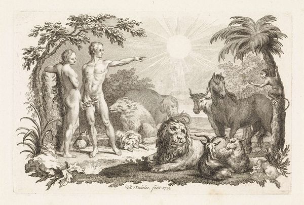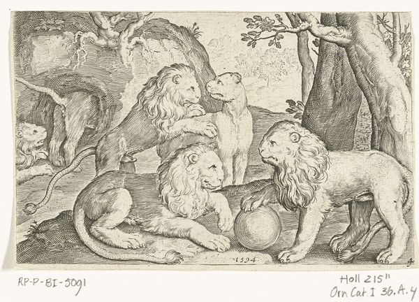 Curator: Here we have a captivating charcoal drawing, "Daniël in de leeuwenkuil," or "Daniel in the Lions' Den," attributed to Willem van der Leeuw, likely created sometime between 1613 and 1665. Editor: It's just… wow. That intense charcoal work! You can almost smell the breath of those lions! There's Daniel, centered and illuminated, radiating a desperate serenity, surrounded by a whole pride of predators, and yet the piece, rather than terror, somehow speaks to a certain hope, to quiet survival. Curator: Precisely! The drama is palpable, isn't it? This drawing really engages with the popular biblical story of Daniel, imprisoned overnight in a den full of lions. According to the narrative, his faith protected him from harm. Editor: Absolutely. I notice that he sits very casually among the lions; not exactly reclining, but comfortable-ish. The positioning has got my wheels spinning: Do you think this comfort suggests less fear and more, maybe, of the sublime and finding beauty even in places that scare the living daylights out of you? I mean, who hasn’t been there? Curator: An insightful reflection. Consider the period: History paintings, even those rendering biblical events, had an important public role. Artists weren’t just illustrating scripture; they were often commenting on contemporary social structures and moral virtues. Daniel's unwavering faith could easily have been seen as an allegory for steadfastness during times of political and religious upheaval. Editor: Mmhmm! Look at how the darkness around the lions presses inward. Even the bright patch above Daniel has a certain menace in its stark lighting. There's the odd inclusion of the skull in the lower-left, which provides an interesting contrast. I do wish the Daniel wasn't looking towards that patch, the lines would be much better with that added dread, almost calling down the weight of the unknown. Curator: That use of chiaroscuro – the contrast between light and shadow – is absolutely key. The unknown pressing inwards, indeed! It not only enhances the visual drama but also subtly suggests that the true source of both danger and salvation comes from something beyond human comprehension. Editor: Well, this drawing has certainly given me something to think about... faith, fear, and the occasional friendly lion. I might think differently next time I go to the Zoo... Curator: Indeed, the power of visual narratives and art to open discussions on social life cannot be understated, and this work offers a powerful reflection of its period.
