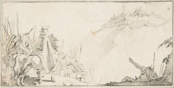 Editor: Here we have "Figuren op een rotsachtige verhoging bij een beek", or "Figures on a Rocky Rise by a Stream," created by Willem Cornelis Rip around 1874-1875 using pencil and watercolor. It has this unfinished, sketch-like quality, a sort of casual snapshot of people enjoying nature. What strikes you most about this scene? Curator: The image appears at first to be a tranquil depiction of leisure. But let's dig a bit deeper: How do the figures interact with the landscape? Consider the composition—who is allowed to simply be *in* nature and who seems to be working at depicting it? How does the artist use light and shadow to convey social roles within the landscape? The seated figure is potentially an artist and his stance recalls issues surrounding who has historically had access to artistic practice and who is rendered a mere subject of artistic or scientific contemplation. Editor: That's fascinating! I hadn't considered the inherent power dynamic. I was so caught up in the idyllic surface. The lone figure by the water – could that be about exclusion, too? Curator: Precisely. Reflect on how the natural world itself has been shaped by colonialism and industrialization, impacting marginalized communities most severely. What is Rip implying here? Is he simply representing a scene, or is he subtly commenting on access and privilege embedded within our relationship to the natural world and the art world? Consider that even leisure is not universally available. Editor: It's amazing how a seemingly simple landscape drawing can reveal so much about societal power structures when viewed through this lens. Thanks, I will consider this next time I approach landscape art! Curator: It's been an honor. Let us seek such context together in the future.