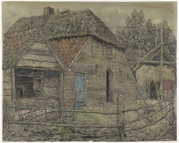 Vincent van Gogh created this drawing, Houses with Thatched Roofs, with pen and ink on paper. The linear precision and intricate detail of the thatched roofs and trees immediately draws the eye. The composition, built of carefully constructed lines, evokes a profound sense of depth. Van Gogh masterfully manipulates the structural elements of the landscape, using diagonal lines to guide the viewer's gaze from the foreground to the background. This technique not only adds dimensionality but also creates a rhythmic pattern, emphasizing the geometric forms of the houses. The strategic use of light and shadow further accentuates the tactile quality of the thatched roofs, giving the work a symbolic weight. The dark, dense lines contrast with the lighter areas, creating a semiotic interplay between form and void. This formal dynamic reflects broader philosophical themes of presence and absence. These elements all contribute to a complex visual and intellectual experience, allowing for a continuous re-evaluation of the artwork's meaning.