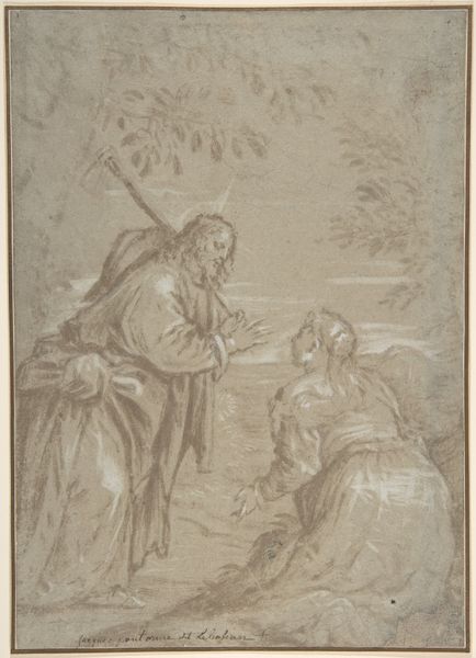 Giovanni Battista Fontana rendered this drawing of Saint Bernard in penitence with pen and brush in brown ink. Observe the prominent skull held by Saint Bernard, a stark memento mori reminding us of mortality’s inescapable grip. This symbol echoes through centuries, appearing in ancient Roman art as a vanitas, reappearing in Renaissance paintings, a constant companion to human existence. Consider how this motif taps into our collective unconscious, stirring primal fears and anxieties about death. The skull is juxtaposed with the cross, symbolizing redemption, and the bishop's mitre to the left, left aside for the penitence of the saint. Together they reflect the eternal struggle between earthly existence and spiritual salvation. This visual language transcends time, resurfacing in varied forms. Each era imbues it with new layers of meaning, yet the core message remains unchanged: contemplate death, embrace morality.