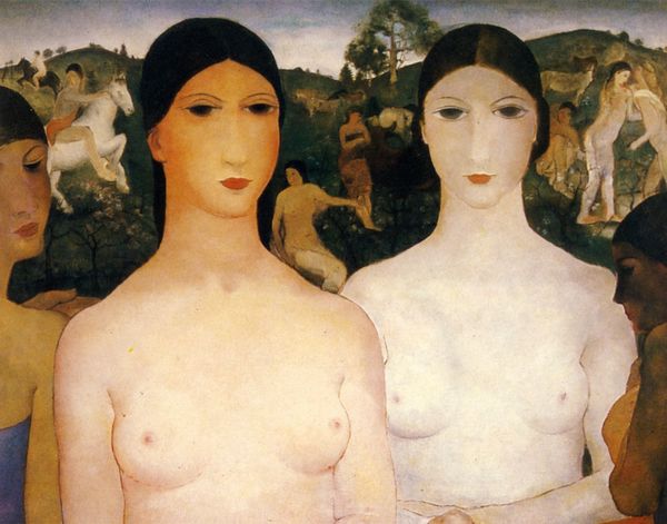 Curator: Before us is "Las Bañistas," or "The Bathers," a 1943 oil painting by Carlos Quizpez Asín. What are your initial thoughts? Editor: I’m immediately struck by a sense of serenity. The subdued palette, the flowing water… it evokes a sense of tranquility, even reverence for the natural world and the female form. Curator: The composition is rather deliberate. We have three female figures arranged within this idyllic landscape, each subtly engaging with the water, the quintessential feminine symbolism of creation and purification. The smooth, almost sculptural quality to the figures contrasts sharply with the stylized, more angular depiction of the surrounding landscape, creating an interesting tension. Editor: I think it's impossible to ignore the gaze of the central figure. It’s direct, confronting even. In 1943, Asín was working within a very specific artistic and political context in Peru, part of a movement grappling with Indigenismo. What do you think this gaze tells us about Asín's positioning of Indigenous women at this moment in Peruvian history? Is this agency or objectification? Curator: A pertinent question. From a formalist perspective, one might consider that the artist is presenting the viewer with this triangular composition and its relationship to these tonal modulations between foreground and background, and the relationship of vertical, angular background planes to soft curved, voluminous figures. Semiotically, we might even consider how each shape or gesture becomes signifier... Editor: While interesting, isn't it perhaps too easy to extract art from sociopolitical contexts? Here, you see depictions of three nude Indigenous women, their skin bronzed like the sun-baked rocks. Asín, a criollo artist, borrows visual codes of European modernism to frame Indigeneity in his own terms. Surely, his depictions are not merely a formal exploration, right? Curator: Naturally, historical contexts must be recognized. The deliberate construction and arrangement can’t be discounted, particularly given its simultaneous figuration and realism within Asín’s overall body of work. The interplay of form, color, and subject certainly produces meaning…but must necessarily take the artist’s lived experience as one potential perspective. Editor: I agree that formalism sharpens our perspective, but to truly comprehend such artwork demands more than formalist musings. Only then can we grasp art’s impact as history and lived reality, intertwined on canvas. Curator: A perfect way to frame its complexities. There's much here that meets both the eye and mind.