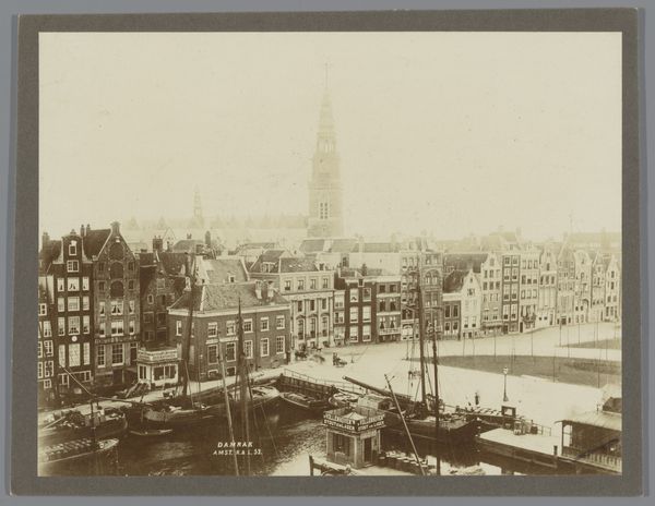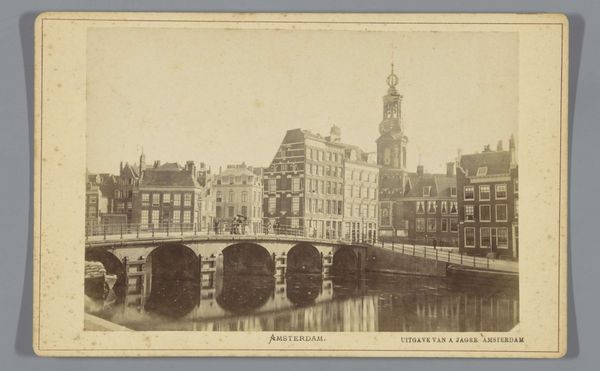 Editor: This is a photograph, "Munttoren gezien vanaf het Singel," taken sometime between 1860 and 1900 by Andries Jager. It looks like a cityscape with a tall tower as the main focal point. What draws my eye is the contrast between the solidity of the architecture and the implied movement of the water. What strikes you about this piece? Curator: As a materialist, I’m interested in the production of this photograph. Think about the wet collodion process likely used, the darkroom a travelling photographer like Jager would have needed, the physical labor involved in lugging around all that equipment. How did this process influence what he chose to capture and how he framed it? Editor: So, the constraints of the process shaped the image itself? Curator: Precisely! Consider the albumen print. The paper itself had to be carefully prepared. The social context of this photograph is also key. Amsterdam was rapidly changing at this time. Was Jager simply documenting the city, or was he contributing to a particular narrative about its growth and modernization? Who was buying these prints, and what did they represent to them? Editor: I hadn't considered the paper itself as part of the story, or how it spoke to a specific consumer. So it's not just the grand Munttoren but also about who commissioned it and the workers behind the final photograph? Curator: Exactly. The print's value isn't inherent but constructed through labor, materials, and consumption. Editor: That's fascinating. I will definitely look at photographs differently now, thinking about all the layers of production involved.