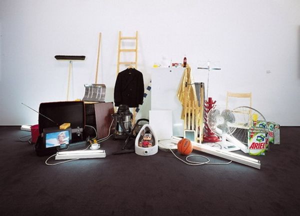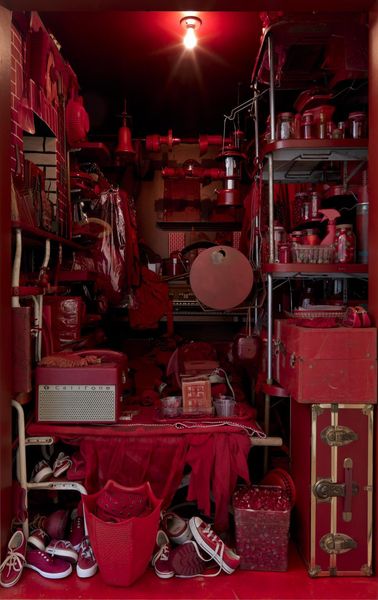 Editor: Jarod Lew's photograph, "Please Take Off Your Shoes", presents a scene of domesticity. The array of shoes scattered across the floor creates a compelling visual texture. What do you notice in terms of its formal elements? Curator: The photograph employs a precise arrangement of objects, directing the viewer's gaze. The stark white walls and the geometry of the garage space contrast with the organic arrangement of footwear. Note the positioning of the open doorway acting as a focal point; how does this affect your reading? Editor: It feels like an invitation, or maybe a staged tableau of everyday life. I'm interested in the way that the composition directs us toward a private space. Curator: Precisely. The artist manipulates the visual plane to convey a sense of intimacy within a structured environment. The color palette, mostly neutral, is punctuated by accents of red and brighter hues, drawing our eyes to specific details. Editor: That's a great observation. Thinking about the composition and color choices really shifted my understanding of the artwork. Curator: Indeed. By attending to these formal qualities, we glean deeper insights into the artist's intent and the work's overall effect.
