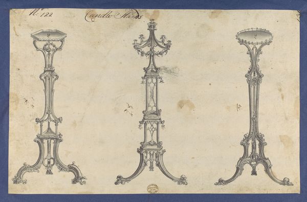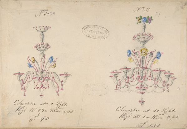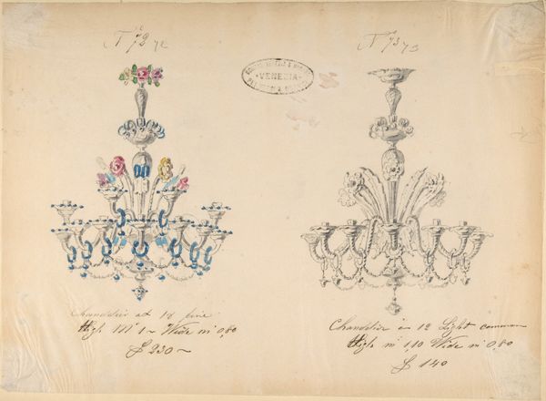 This sheet of drawings of glassware; mirrors, chandeliers, goblets, et cetera, was created by the Compagnia di Venezia e Murano between 1872 and 1909. These designs offer a glimpse into the late 19th-century fascination with ornate, handcrafted objects which were seen as luxury goods. Created during an era of increasing industrialization, the designs evoke a sense of nostalgia for traditional craftsmanship. Notice the attention to detail in the delicate lines of the glassware, a skill passed down through generations of Venetian artisans. The drawings also speak to the social and economic structures of the time. The production of Murano glass was a labor-intensive process, often involving entire families. These objects reflected and shaped the identities of both the artisans who made them and the wealthy consumers who acquired them. Imagine these chandeliers illuminating grand ballrooms, casting a warm glow on a society grappling with shifting identities and emerging social hierarchies.