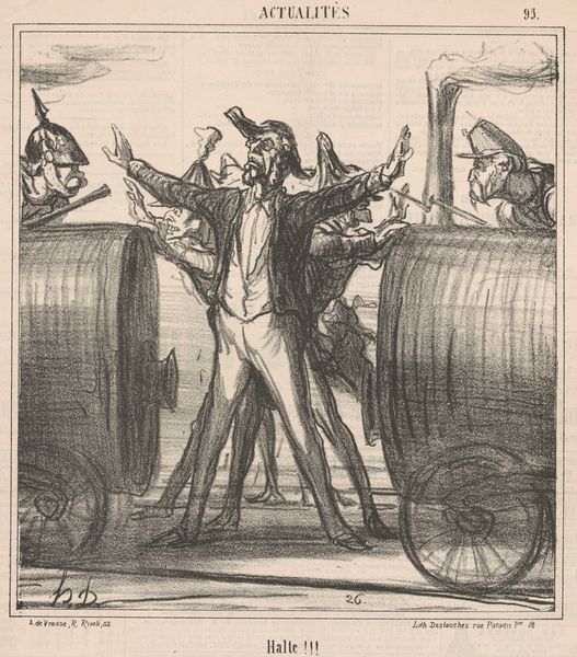 Editor: This woodcut from 1839, "Macaires kamp med hunden" by Axel Theodor Kittendorff, is pretty intense. It features a man battling a dog, seemingly in a trial by combat? The mood is definitely fraught, and the stark lines create this feeling of immediate danger. What strikes you most when you look at it? Curator: You know, the first thing that hits me is the oddity of the stage it sets. That jury box backdrop... it's like watching a puppet show with extremely high stakes. This is history painting distilled to its raw, absurd core. Is it just me, or does the whole scene feel oddly… staged, like a theatre play. Is that barrel there just for some dramatic irony? Editor: Definitely theatrical! I hadn’t thought about it like that, but I see what you mean about it feeling staged. It also feels pretty crowded within the frame, even though it's mostly empty space filled with line work. What's with the flatness of the figures, almost cartoonish, which makes the drama both intense and slightly humorous? Curator: Precisely! That tension is key. Kittendorff seems to be playing with our expectations. History painting usually aims for grand pronouncements, but here we've got this scrappy, almost comedic rendering. It's like the artist is asking: How seriously should we take these historical dramas? Think about it – is he perhaps inviting us to see the human drama in these ‘serious’ historic stories or, with some irony, poking at our self-importance when it comes to historical sagas? Editor: That makes so much sense! I guess I was so focused on the immediate conflict that I missed the bigger picture. The artist definitely throws us a curveball. So, what I thought was a somewhat simple depiction becomes layered. Curator: Absolutely. It's that playful tension that makes this piece so compelling. It tickles you with questions rather than thumping you over the head with answers. It's almost…cheeky!