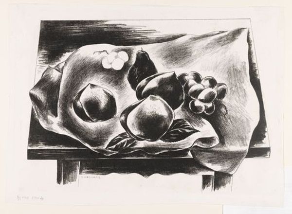 Wanda Gág said she was charmed by the way cats “fit themselves into and over all sorts of places and spaces.” Here their blissful pliability contrasts with the hard geometries of stove, logs, and kindling box. Our eye travels from curve to curve around a warm pool of light. Surprisingly, Gág had only two cats while making Siesta: Snoopy and Snooky. She sat and sketched their antics on the kitchen floor, then used their various poses for this print. The same cats were her models for her book Millions of Cats ten years earlier.
