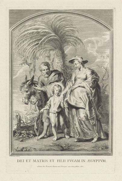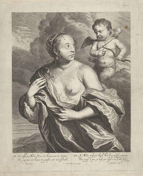 Curator: This engraving, likely dating between 1633 and 1673, is titled "Maria en het Christuskind aanbeden door Cesare Alessandro Scaglia," a Baroque piece currently residing in the Rijksmuseum. Editor: Oh, instantly I'm hit by this strange calmness, almost like a muted stage play. The textures, achieved solely through line work, give everything this lovely, almost unreal quality, wouldn't you agree? Curator: Precisely. Considering Scaglia's political involvements and his diplomatic missions, we can contextualize this image as both a testament to devotion and a carefully constructed emblem of power dynamics during the period. How are these individuals situated politically and culturally? And how might these societal structures affect their everyday experiences, desires, and values? Editor: Right, and beyond the socio-political, I'm caught by the composition itself – this odd triangular balance with Mary, the child, and Scaglia forming the points. I feel like I'm looking at this through a strange nostalgic lens. This family are set in front of these amazing drapes that hide… well what’s behind them is something left to the imagination and creates an ethereal plane to contemplate. What did the artist have to say and more precisely what wasn't he or she saying, you know? Curator: The engraving itself, as a medium, offered accessibility; this allowed for a wider distribution of religious and political ideals, subtly influencing perceptions and consolidating power structures. Scaglia, as a key figure, is literally positioned to partake in, perhaps even orchestrate, the dynamic we see unfolding before us. This work begs questions about societal hierarchies. Editor: Indeed! The lines aren't merely lines. They become texture, light, shadow, history...it is kind of mesmerizing, how such precision evokes a feeling and the same with Scaglia's position: it suggests both piety and authority in a subtle, powerful, really clever interplay! I can appreciate the artist's intentions or message with ease. I would really think about this piece. Curator: Ultimately, viewing “Maria en het Christuskind aanbeden door Cesare Alessandro Scaglia” necessitates examining its role in propagating specific ideologies, and to consider how this affects both those within and outside the frame. Editor: Well, after a closer inspection, its impact, which goes beyond the visible makes me reflect and realize how this engraver left this painting linger a bit longer with each strike! It invites questions to reflect and feel.