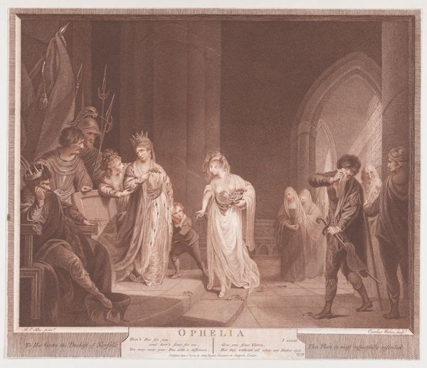 Editor: We’re looking at "The Idolatry of King Solomon," an oil painting by Willem de Poorter, created sometime between 1630 and 1648. The atmosphere is heavy, almost theatrical, wouldn’t you agree? So many figures in muted colours gathered around what seems to be a pagan altar. What strikes you first when you consider this composition? Curator: Immediately, I'm drawn to the strong diagonal arrangement—the steps leading the eye upwards, culminating in the statue. Note the stark contrast between the textures. The smoothness of the marble sculpture against the richly draped fabrics creates a palpable tension. Consider also how light is used to highlight the main figures, Solomon, and the priest, while the background recedes into darkness, amplifying the drama. Do you observe how Poorter uses a limited colour palette to further unify the composition? Editor: Yes, it's mostly browns, golds, and reds... how do you see that choice impacting the work's interpretation? Curator: The deliberate restriction in palette concentrates our attention. It limits narrative possibilities. The viewer is invited to decipher the relationship between forms. The interplay between the cold marble and the opulent textures within the muted tonal range contributes to an internal structural dialogue within the piece itself. It moves beyond the historical narrative into the realms of pure visual form and contrasts. What's your takeaway from the arrangement? Editor: I see a formal depiction of faith corrupted through line and form! Thank you! Curator: Indeed, a lesson subtly embedded in the formal structure itself.