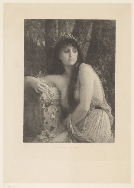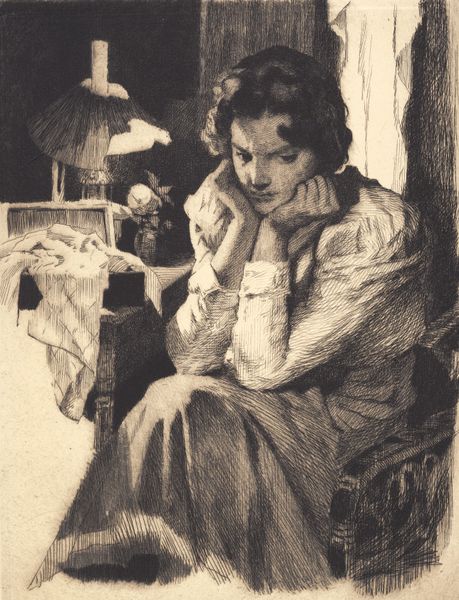 Editor: It looks as though she's had a long day, wouldn’t you agree? A woman in repose; there's something languid about the figure and scene. Curator: Indeed. What you're perceiving, I think, is partly due to Tissot's sensitive deployment of etching. Here we have "Summer Evening," completed in 1881. What's striking is how the aquatint technique captures varying light tonalities; observe how he layers in a density of shadows. Editor: One immediately picks up on this labor. Look how the weave of the wicker chair has been intricately rendered with what appears like sheer, grueling mark-making. It emphasizes her place, doesn't it? And note how she's reclining amidst those plush textiles – the image really speaks to ideas about leisure and social class, doesn't it? Curator: Yes, Tissot’s precise linear articulation and careful rendering of form create a spatial and thematic hierarchy within the picture plane itself. Her languidness contrasts effectively with the implied rigid geometric structure surrounding her form. Editor: And it’s precisely in that interplay – between what is literally ‘soft’ and ‘hard’ – that we discover commentary regarding a consumerist desire for material comfort at the height of industrial capitalism. Note the composition with which she displays her fashionable stockinged feet and opulent dress! The very materials speak volumes! Curator: Perhaps, but I am also drawn to the work’s masterful exploitation of line, creating, not simply representing, the woman and her position. Look at the botanical patterns present throughout her dress, repeated but shifted as tonal depth and the position of the viewer shift. These repeated shapes, in their geometric variance, reflect an order implied rather than defined. Editor: True, there is clearly an implied artificiality to the composition, almost to the point of excess, and a distinct focus on commodity fetishism. Curator: Regardless of what underpins our interpretations, the careful formal tensions make Tissot’s aesthetic project worth prolonged consideration. Editor: Agreed. The textures, her clothes, it makes one think about the making of such materials, what labor produces such leisured space!