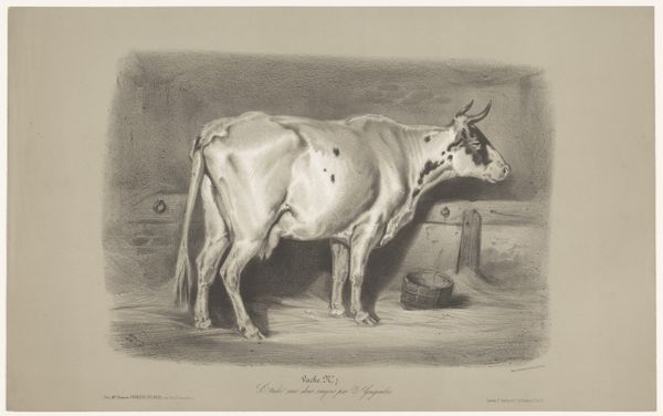 Editor: This is Eugène Verboeckhoven’s “Stier,” or “Bull,” created in 1844. It’s a pencil drawing and print. I find the realism pretty striking, especially the way the artist captured the texture of the bull’s fur. What stands out to you? Curator: What strikes me is how this image normalizes the patriarchal structures embedded in agricultural practices. We see the bull not just as an animal, but as a symbol of power and ownership, central to the economic and social order of the time. Consider the role of livestock in 19th-century Belgium. How does the bull represent control over the natural world, reinforcing a hierarchical system? Editor: So you're saying the artwork isn't just a portrait of a bull, but also a commentary on society? Curator: Precisely. Look at the setting – the stable. It reinforces a sense of confinement and control. The bull, despite its size and strength, is penned in, managed. What do you think this says about our relationship with animals and resources during that period, or even today? Editor: It’s thought-provoking. It almost makes me uncomfortable seeing it like that. I was just admiring the artist's technique! Curator: And that's valid! The skill is undeniable. But art doesn’t exist in a vacuum. Considering the historical context can reveal layers of meaning and prompt us to reflect on contemporary issues of animal rights, environmentalism, and social hierarchies. How might a feminist reading challenge the overt masculinity associated with this bull? Editor: I see what you mean. Viewing art through that lens brings up different points. Curator: Indeed. By engaging with the art through a historical and theoretical perspective, we gain insight into our cultural values and their impact on power structures. Editor: I definitely see the artwork differently now. Thanks for that. Curator: It’s been enlightening exploring those perspectives with you. It goes to show, looking at art is more than what immediately meets the eye.