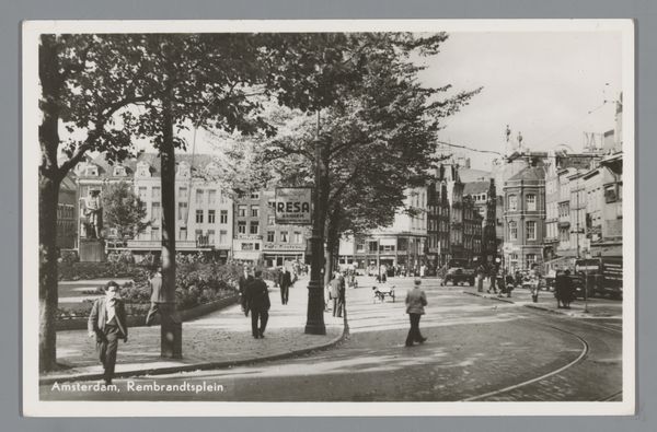 Curator: This print, called "Street Scene," comes to us from an anonymous artist—a real mystery, isn't it? Editor: It is rather gloomy at first glance, a gathering dusk maybe? But then, there's movement, folks milling about, a flicker of everyday life. Curator: Absolutely. The symbols feel quite loaded—the dark buildings, the figures converging near what looks like a well or fountain, perhaps hinting at community and sustenance? Editor: Or secrets being shared at the town well! It has the same feeling as early photography, a frozen, formal quality amidst the implied bustle. Curator: Exactly! It's as if a moment is caught between stillness and the rush of time. An unsung poem to a forgotten place, perhaps. Editor: Yes, a muted visual record, holding stories we can only imagine, which makes me appreciate the image all the more.