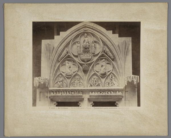 Curator: Welcome. We are standing before "Gothic Niches with Stone Canopy," a drawing by Karl Ballenberger, currently held in the Städel Museum's collection. It seems we don't have an exact date for this work. Editor: My immediate impression is one of measured elegance. The repetition of forms, the subtle gradations of shade—it possesses a somber grace, wouldn’t you say? The verticals provide structure, but they don't come across as forceful. Curator: Yes, the upward thrust characteristic of Gothic architecture is certainly present, though subdued, softened by the monochromatic rendering. Those stylized foliate capitals evoke the natural world brought indoors, almost as if beckoning pagan nature spirits to enter the fold of sacred space. Editor: I am struck by the relationship between light and shadow, and the interplay of line versus volume, in creating depth on an otherwise flat plane. The precision of the ink strokes and their arrangement builds these arched structures to a fine art of geometry. Look closely, though: are there errors? The canopy's elements don't perfectly mirror. Curator: Ballenberger's work displays a vision of aspiration towards divinity and order, but these slight imperfections perhaps remind us that even in sacred spaces, human presence makes its mark. In symbolic terms, this imperfect repetition can represent an inherent aspect of mortal understanding of a sacred whole, that is by definition so big that it is incomprehensible by us in its entirety. Editor: Interesting observation. For me, this image seems less about symbolic gesture, and more about presenting its core essence: geometric elements combine to produce architectural form through a mastery of drawing as an art form in and of itself. It also displays artistic talent beyond craft. Curator: On one hand, you have these individual pointed arches, suggestive of fingers pointing to the heavens. And above, the more complex geometric repetitions of the canopy itself. This can symbolize many attempts from humankind reaching out, not one single element. What might those repetitive elements represent in your opinion? Editor: You see that architectural motif as "reaching," whereas I consider that crenellated effect purely in terms of surface design. Curator: Well, as much as our interpretations might differ, one can agree this piece presents a fascinating window into the architect's mind at the moment when function, art and, most importantly, spiritual yearning became one. Editor: Indeed, regardless of one’s focus, there's no denying this artwork gives us insight into both design practice and enduring architectural vocabulary, wouldn’t you say?