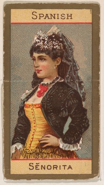 Curator: This is a piece from 1890 entitled “Icelandic, Lady of Reykjavik,” created by the Kinney Brothers Tobacco Company, part of their "Types of Nationalities" series. Editor: It's quite striking, actually. The woman’s vibrant complexion and cool-toned clothing juxtapose in a way that’s…arresting, but what’s she doing? Who is she representing beyond some generic nationality? Curator: Well, these were trade cards, inserted into cigarette packs. They were immensely popular, functioning almost like early baseball cards, boosting sales through collectibility. Editor: Ah, the engine of commerce. So this "Icelandic Lady" becomes a vehicle for selling tobacco? How does the company's production methods align with Icelandic realities and stereotypes? It's another instance of cultural appropriation for capital gain, isn’t it? Curator: One could definitely make that argument. Think about the chromolithography itself. The process required highly skilled laborers creating printing stones—a complex, multi-stage method that was quickly becoming automated at the time. We must also acknowledge Kinney Brothers and the social landscape that made these pieces of ephemera so sought after. Editor: Right, that leap from handmade craftsmanship toward machine reproduction represents a profound shift in the value and dissemination of images. And these images reinforced specific power structures: Western conceptions of other cultures sold back to a Western audience to increase the wealth and power of industries rooted in colonial extraction. It seems she almost embodies Iceland itself, a kind of subjugated object under the imperialist gaze. Curator: I can see how one could get that impression when focusing on the materials themselves and the economic model driving production. Editor: It's about tracing the network. From the minerals used to make the paints to the global shipping routes involved in tobacco sales, it highlights complex material relationships—economic dependencies, unequal distribution, and exploited labor practices. Curator: These types of works highlight these intersections of industry, labor, and consumer culture in a surprisingly compact form. Editor: Exactly! Looking at “Lady of Reykjavik” is like holding a condensed history lesson in capitalist enterprise, art as commodity, and questions about identity in your hands. A product to question as much as to consume.