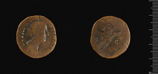 Curator: What a wonderfully worn piece! This is a sestertius, a Roman bronze coin, of Faustina I. Editor: It looks incredibly tactile, almost begging to be held despite its obvious weathering. It makes me think about what hands might have held it. Curator: Exactly. These weren't just currencies; they were tools of imperial propaganda, distributed widely to project power and ideals. Faustina, as the wife of Emperor Antoninus Pius, became a powerful image, even after her death. Editor: So, by handling this object, one encountered a visual representation of the Roman state and their leadership. I suppose that’s a lot of power loaded into a single coin. Curator: Yes, the sheer volume of these coins and the ways in which they were used and abused shows us how materiality shapes our understanding of history. Editor: It is fascinating how a single object, seemingly small, opens up such a broad understanding of its historical and social importance.