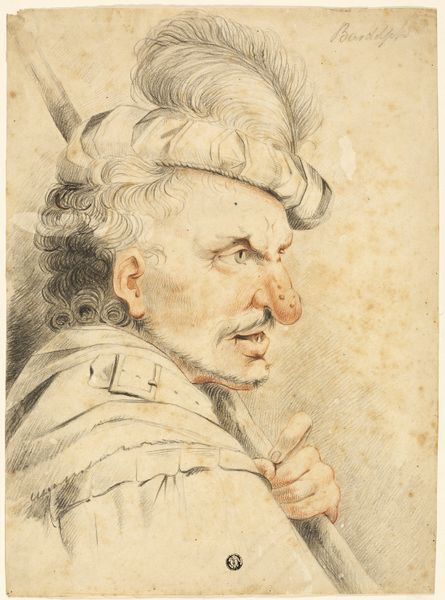Charles Parrocel created "Head of a Soldier," a drawing rendered in sanguine, sometime between 1688 and 1752. The figure confronts us head-on, his hat casting a shadow that complicates our view. Parrocel's choice of sanguine, a blood-red chalk, is critical. It lends warmth and immediacy to the soldier's face, drawing our attention to the expressive lines that define his features. The hatching and cross-hatching techniques give depth to the composition, setting the soldier against a lightly sketched background. The materiality of the chalk, with its soft, granular texture, suggests a fleeting moment captured in time. Parrocel uses the dynamism of line to imply movement and vitality, challenging the static nature of portraiture. It’s in this tension between the monumental and the momentary that the drawing finds its power, inviting us to consider how representations of authority and strength are always constructed, never fixed.