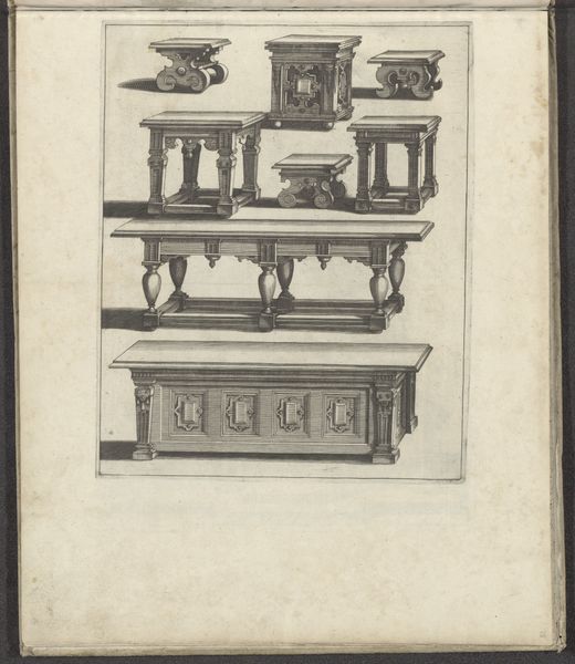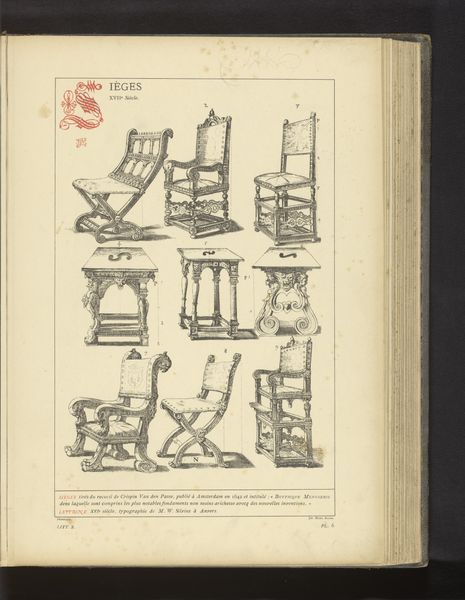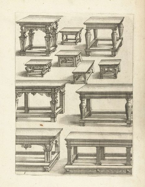 This drawing, whose creator is unknown, presents us with a study of furniture: six chairs and three stools. Notice how the artist uses line to define each object, employing hatching and cross-hatching to suggest form and shadow. The layout is structured, a grid of possibilities almost, presenting a range of designs for domestic seating and surfaces. The pieces, while utilitarian, are imbued with a sense of status through their elaborate carving and ornamentation. We might consider this drawing as an early exploration of design and seriality, where functional objects are elevated through aesthetic consideration. Take note of the variations in style – from the folding chairs with their suggestion of portability to the more fixed and imposing armchairs. The artist challenges the fixed nature of design, suggesting that the function of furniture is not just physical but also symbolic. This drawing then, is not just a catalogue but a proposition about how we ascribe meaning to the objects that populate our lives.