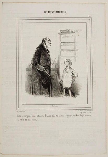 Curator: This lithograph by Paul Gavarni is titled, "Papa, make Francoise stop making fun of me all the time . . ." It captures a seemingly tender moment between father and son. Editor: Tender? Really? To me, it looks like the kid's about to launch into a full-blown operatic aria of sibling rivalry. The dad seems… detached, preoccupied. Curator: Gavarni often used his art to critique social norms and class structures. The power dynamic here, even within a family, reflects broader societal inequalities. The boy’s plea highlights his vulnerability, the father’s disinterest, perhaps, a commentary on patriarchal indifference. Editor: Or maybe Dad’s just had a long day and this is the tenth squabble he's mediated. I feel the eye-roll of a thousand weary parents radiating off that page. It's funny, in a dark, relatable way. Curator: Perhaps. But by framing it within the series “Les Enfants Terribles,” Gavarni invites us to consider how societal pressures shape even childhood experiences. Editor: Maybe we’re both right! It’s a simple scene that reflects on many levels about growing up, with a bit of wit and charm.
