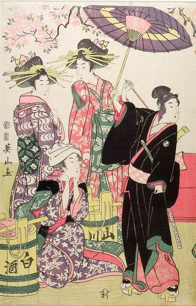 Editor: This watercolor, “Trés Parisien, 1927, No. 3, Pl. 7: Créations JEAN MAGNIN - TEA FOR TWO”, seems like a page from a fashion magazine. It’s quite delicate, almost dreamlike with its soft pinks and greens. How do you interpret this work? Curator: What I see is a fascinating encapsulation of the Art Deco era, but also a complex reflection of women's roles and societal shifts. The figures, adorned in luxurious loungewear, speak to a leisure class, but the angularity and stylized forms are deeply rooted in the burgeoning industrial age and modernism. Let's consider what 'leisure' truly meant in 1927, particularly for women. What societal expectations do you think these images challenge, or perhaps, reinforce? Editor: That’s an interesting point about leisure. I suppose I hadn’t thought about it beyond just surface aesthetics. Curator: Right. It's also crucial to consider the magazine context. Who was the intended audience for "Trés Parisien?" Understanding that demographic will further illuminate what the artwork sought to convey about femininity, aspiration, and consumption. Do you notice any hints in the composition itself that may indicate social status, or power? Editor: Well, they are wearing what seems to be pajamas and robes…maybe it speaks to a form of intimate female bonding, shared secrets. But I see what you mean, that doesn't preclude the possibility that this image participates in much broader questions on femininity and capitalism. Curator: Precisely! These images reflect the aspirations and realities of a generation navigating newfound freedoms and entrenched societal norms. The intersection of these narratives, captured within this single image, gives us a valuable lens through which to examine the past and how it echoes into our present. Editor: Thanks for guiding me through this. I’m leaving this discussion feeling much more curious! Curator: It was a pleasure; these images of beauty are often much more than meets the eye.