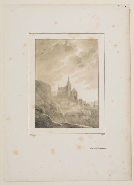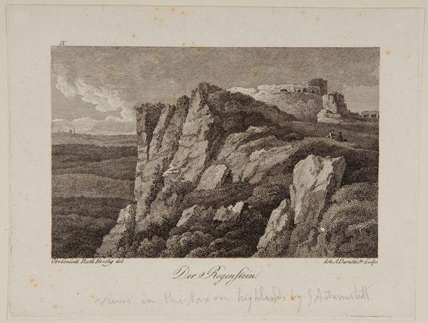 Curator: This lithograph, "Ruins of the Bouzols Castle, Near a Hill in Velay," by Eugène Isabey, captures something truly haunting. Editor: My first thought? Melancholy. That looming castle, crumbling yet defiant, it whispers stories of time and decay. Curator: The cross in the foreground—it's almost like a visual plea against the ravages of time, a symbol of enduring faith amidst ruin. Editor: Yes, the cross is a powerful reminder of spiritual continuity, contrasting with the impermanence of earthly structures. The castle, once a symbol of power, is now a shell, a testament to the transience of human ambition. Curator: Isabey's detail—look at the way he renders those craggy rocks and storm-swept skies! It's a landscape heavy with history. Editor: Absolutely. And those deep shadows! They speak to the shadows within us all, the memories and experiences that shape our perceptions. Curator: It's like Isabey is showing us that even in ruins, there is a strange, enduring beauty. Editor: Exactly! This image invites us to confront the inevitability of change and to find resonance in what remains.