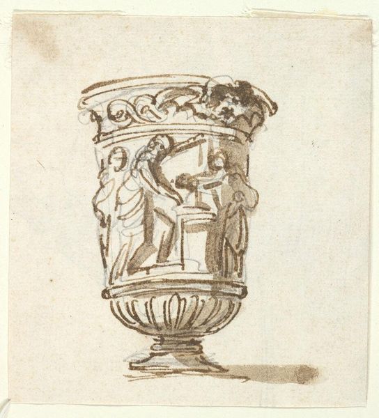Curator: This etching by Françoise Bouzonnet, dated 1667, is titled "Vaas met drie staande figuren in reliëf"—Vase with Three Standing Figures in Relief. Its stark linearity immediately calls to mind neoclassical forms and sensibilities. Editor: It does have a severity to it, doesn't it? But also, an elegant stillness. The light catches the vase just so, highlighting its form. The hatching gives a wonderful sense of volume to both the vase and figures depicted upon it. Curator: Precisely. And those figures – frozen in classical poses, adorned in what appear to be Greco-Roman robes. The semiotic density here is noteworthy: observe their postures, their interactions; how these design elements affect our perception of the artifact's historicity. Editor: Absolutely, and beyond that the positioning of this etching, even within the grander scale of 17th century France—a time of aristocratic opulence—presents something that almost echoes republican values through the chosen figures. Curator: A valid interpretation, yes, but allow me to interject that such an evaluation is perhaps too forward, ignoring the deliberate formal restraint. The balance—achieved through a limited palette of grays and whites—points to a focused, self-contained, structural whole. Editor: But the social context is undeniable! France at this time was heavily invested in reviving Classicism, architecture, and design to bolster a sense of legitimacy. Wouldn't this influence inform our reading of the image as potentially having sociopolitical dimensions? Curator: No doubt cultural undercurrents ripple within the piece, but let us appreciate first the artistry. The line weights, their varying intensities which conjure light and shadow – elements crucial to the work's innate visual success. One need not ignore social histories—indeed these considerations amplify the reading. Editor: Well put. It gives a certain feeling, doesn’t it? Not only of the classic style itself but that this rendering on paper helps the memory of these styles carry forward to viewers in Françoise's lifetime, allowing them to reflect, imitate, and revive these styles for new audiences. Curator: The structural precision—its very own inherent architecture—reflects artistic intentions above anything. Editor: Still, its ability to engage the social sphere remains palpable—perhaps because the forms that define it were themselves produced within certain cultural environments. Thank you for enlightening me regarding this artwork.