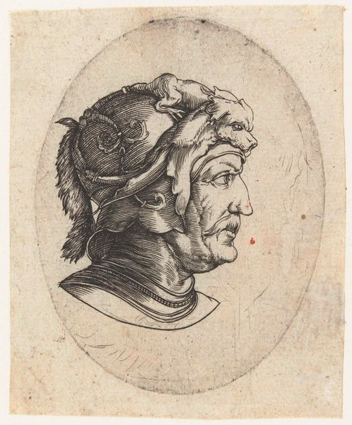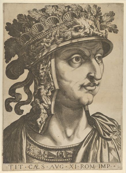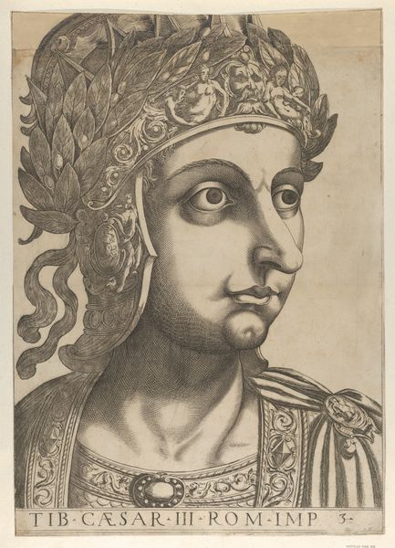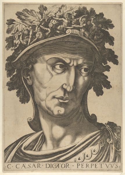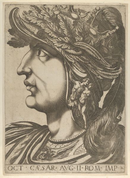 Editor: This is "Plate 4: Caius in profile facing left, from 'The Twelve Caesars,'" dating from 1610 to 1640. It's an engraving, currently at the Metropolitan Museum of Art. The detail is just incredible – especially in the helmet. What do you see in this portrait? Curator: The overwhelming imagery! It’s a striking example of how rulers used iconography to project power. Beyond the immediate likeness of Caligula, it’s crucial to consider the symbolic weight of his attire, that elaborate helmet especially. Editor: So the helmet isn’t just decoration? Curator: Oh, absolutely not! It is a battlefield of meaning, brimming with tiny figures. Look at them—they could represent conquered enemies, mythological narratives, or even allegories of his reign. Each addition transforms the ruler into a walking emblem, a symbol designed to be interpreted and remembered. What emotions do these symbols evoke for you? Editor: I guess, initially, just… excess. Maybe even instability? Like, there’s too much going on. It makes him seem almost… vulnerable, in a weird way. Curator: A perceptive observation. Does that feeling of unease shift when considering how later artists portray rulers without these elaborate, arguably absurd displays of power? Think of the implications surrounding simplicity and authenticity in visual rhetoric over time. Editor: That's interesting, I hadn't thought of that. It makes me wonder about the changing relationship between image and power throughout history. Curator: Exactly! It is exciting to consider how cultural memory and political symbolism intersect, influencing everything from art to our contemporary visual landscape. Editor: This has been such a great new perspective. Thanks so much!